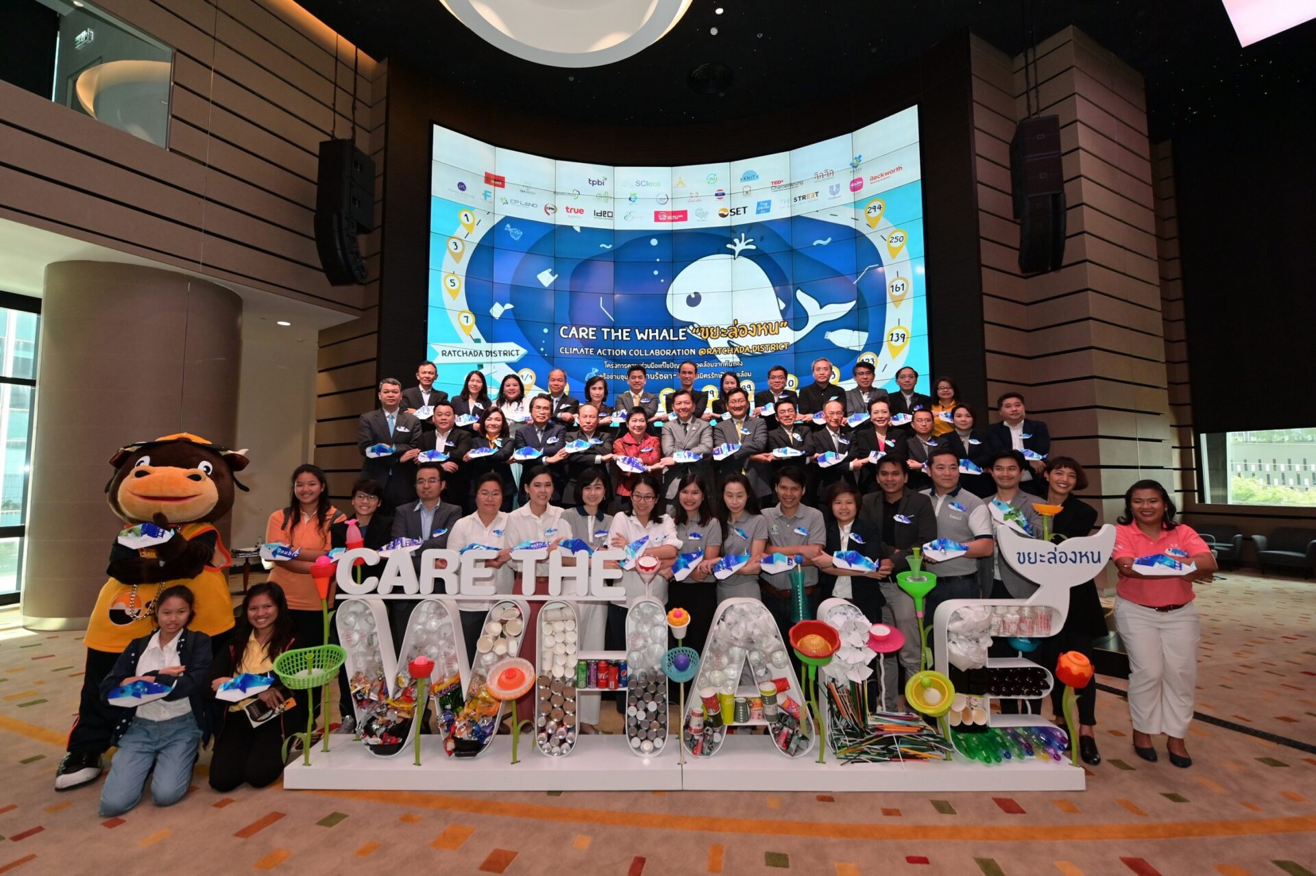 ความร่วมมือที่เริ่มต้นจากการบริหารจัดการสิ่งแวดล้อมในย่านรัชดาภิเษก นำร่องโดย 14 องค์กร บนพื้นที่ร่วม 600,000 ตารางเมตร มีพนักงานจาก 14 องค์กรที่อยู่ในพื้นที่กว่า 30,000 คน ร่วมสร้างย่านน่าอยู่ โดยมีจุดเริ่มต้นจากการทำให้ขยะล่องหน การจัดการของเสียอย่างไม่เบียดเบียนสิ่งแวดล้อม ทั้งนี้ คนในย่านจะเป็นต้นแบบ เป็นพลังหลักในการขยายแนวคิดนี้ไปยังผู้มาเยือนย่านรัชดา ซึ่งแต่ละเดือนมีมากถึง 1.3 ล้านคน โดยมีวาฬ (Whale) เป็นตัวแทนของระบบนิเวศน์ที่รอให้มนุษย์เข้ามาแก้ไขและสร้างความสมดุล ทั้งนี้ ในทางปฏิบัติ “Care the Whale ขยะล่องหน” ได้มีการสร้างเครื่องมือกลาง Care the Whale Calculator ช่วยในการคำนวณ-ทบทวน-ประมวล ผลการปล่อยก๊าซเรือนกระจกจากการลดขยะต้นทาง เพื่อให้มองเห็นผลลัพธ์ ที่เป็นรูปธรรม และเป็นประโยชน์ในการออกแบบแผนดำเนินงานด้านสิ่งแวดล้อมทั้งกระบวนการ ตั้งแต่ ลดการใช้ ลดการเกิดขยะ ทั้งนี้ สำหรับการนำขยะไปแปรรูปหรือนำมาใช้ใหม่ และการกำจัดขยะ ได้ร่วมมือกับพันธมิตรนอกย่านที่มีศักยภาพในการแปรรูปและกำจัดขยะอย่างมีประสิทธิภาพ อย่างไรก็ดี ภายใต้ความร่วมมือดังกล่าวจะนำไปสู่การต่อยอดการเป็นย่านน่าอยู่ครบทุกมิติในอนาคต ด้วยการแลกเปลี่ยนเรียนรู้ ทั้งเรื่องการบริหารจัดการสิ่งแวดล้อม การสร้างความเข้มแข็งด้านความรู้ทางการเงิน และการท่องเที่ยวในเชิงเศรษฐกิจหมุนเวียน