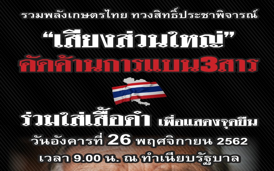 นายสุกรรณ์ สังข์วรรณะ เลขาธิการสมาพันธ์เกษตรปลอดภัย กล่าวว่า เกษตรกรที่เดือดร้อนจากการยกเลิกใช้พาราควอต ไกลโฟเซต และคลอร์ไพริฟอสทั่วประเทศ พร้อมใจกันแต่งชุดดำ เพื่อเข้าร้องเรียนถึงความเดือดร้อนต่อนายกรัฐมนตรีวันที่ 26 พฤศจิกายนนี้ โดยเลื่อนจากเดิมที่นัดหมายวันที่ 28 พฤศจิกายน ทั้งนี้ เพื่อให้นายกรัฐมนตรีแก้ปัญหาก่อนที่คณะกรรมการวัตถุอันตรายจะประชุมวันที่ 27 พฤศจิกายน
