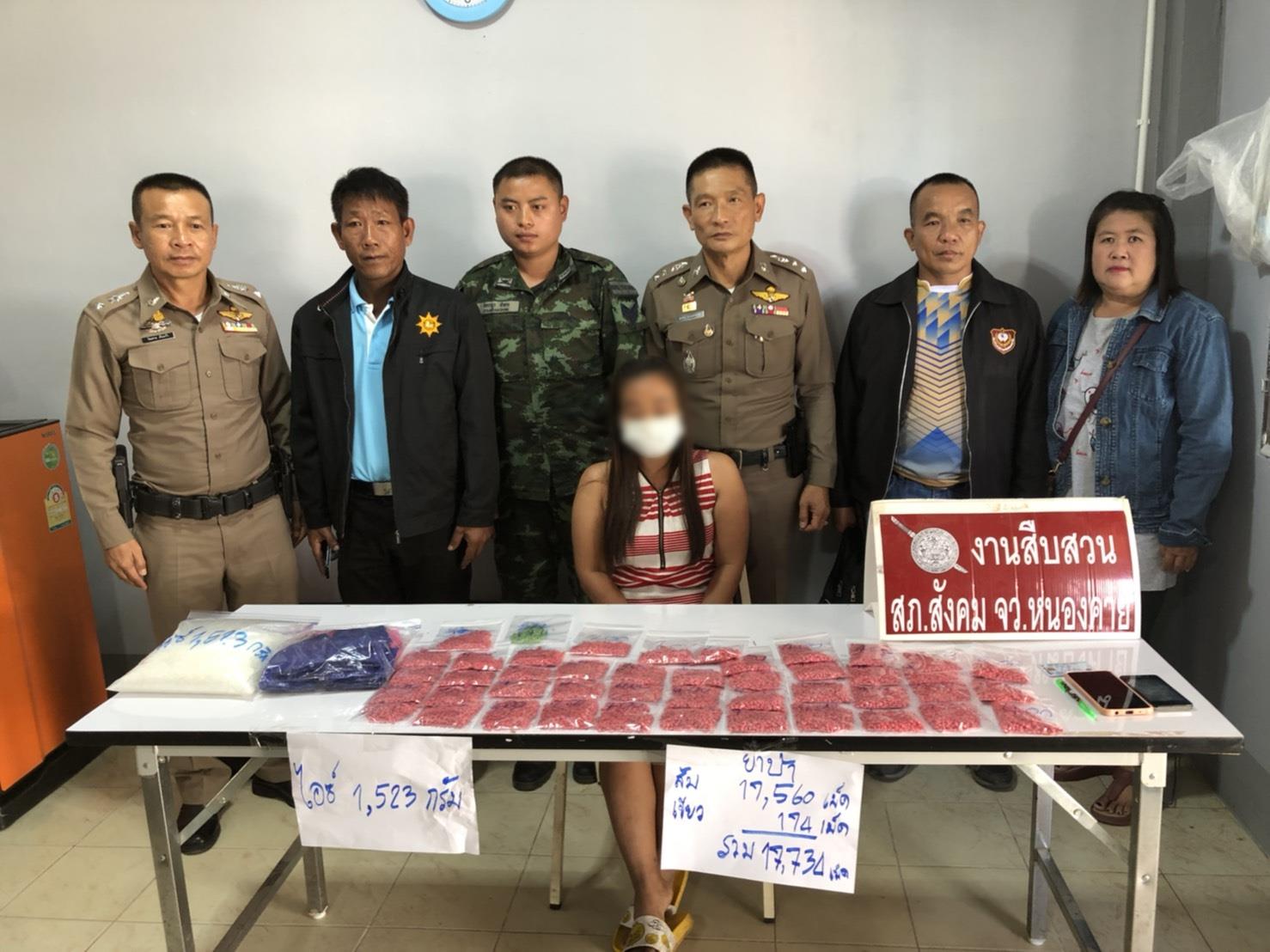 เมื่อเวลา 12.00 น. (22 พ.ย.) พ.ต.อ.สมชาย สงวนศักดิ์ภักดี ผกก.สภ.สังคม จ.หนองคาย แถลงจับกุม น.ส.ศิริพร ศรีสุข อายุ 30 ปี พร้อมของกลางยาบ้า 17,734 เม็ด ไอซ์ 1.523 กก. โทรศัพท์มือถือ 1 เครื่อง และสมุดบัญชีเงินฝาก 1 เล่ม ซึ่งก่อนหน้านี้ น.ส.ศิริพร เดินอยู่ริมถนนข้างโรงเรียนบ้านปากโสม ต.ผาตั้ง ลักษณะท่าทางพิรุธ แขนกางผิดสังเกตุ จึงเชิญตัวมาให้เจ้าหน้าที่หญิงตรวจค้นพบห่อยาบ้าและไอซ์พันไว้รอบอกและหน้าท้อง จำนวน 70 ถุง นอกจากนี้ ยังตรวจสารเสพติดในร่างกายพบสารสีม่วงในปัสสาวะ เบื้องต้นเจ้าหน้าที่แจ้งข้อหามียาเสพติดให้โทษ ประเภท 1 ยาบ้า ยาไอซ์ ไว้ในความครอบครองเพื่อจำหน่ายโดยผิดกฎหมาย และเสพยาเสพติดให้โทษประเภท 1 โดยผิดกฎหมาย