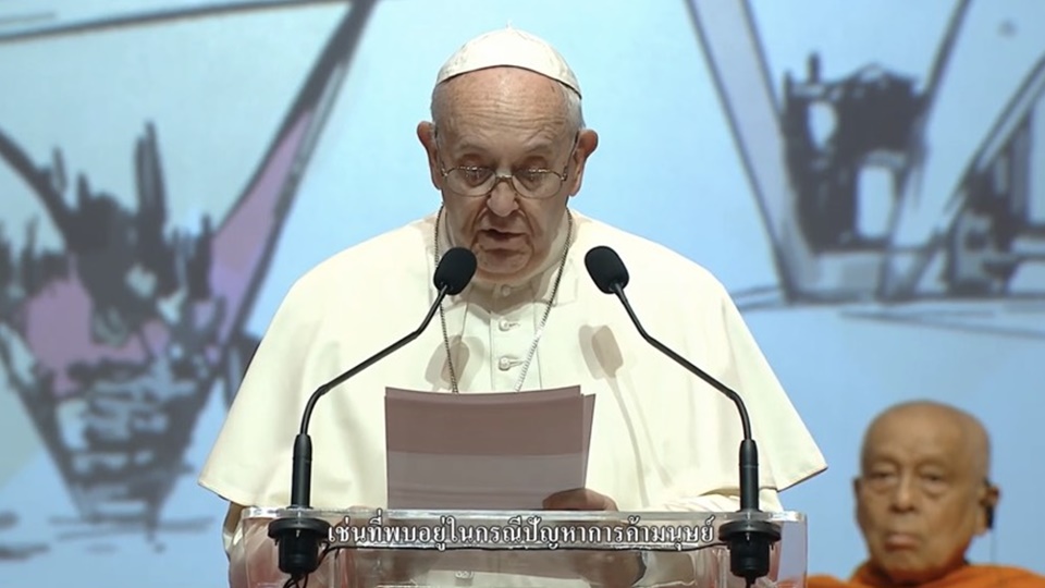 จุฬาฯ 22 พ.ย.- สมเด็จพระสันตะปาปา เสด็จไปยังจุฬาลงกรณ์มหาวิทยาลัย ทรงแสดงปาฐกถาในหัวข้อ “สร้างสะพานแห่งความเข้าใจและสันติสุข” ระบุความร่วมมือระหว่างศาสนาต่าง ๆ เป็นสิ่งที่มีความสำคัญต่อมนุษยชาติในการเผชิญกับปัญหาที่ซับซ้อนในปัจจุบัน