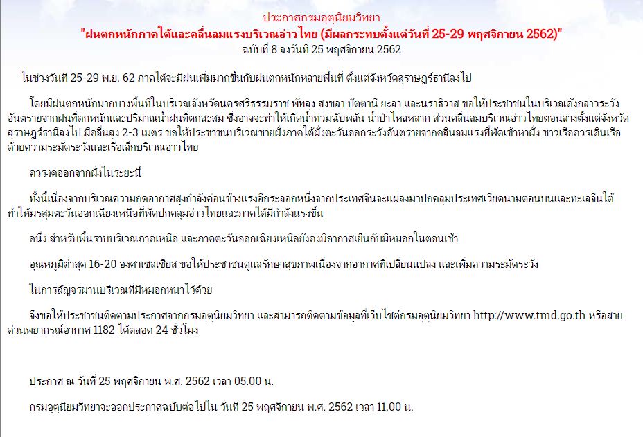 กรมอุตุนิยมวิทยาประกาศเตือนฉบับที่ 8 เรื่องฝนตกหนักภาคใต้และคลื่นลมแรงบริเวณอ่าวไทย ช่วงวันที่ 25-29 พ.ย. 62 ภาคใต้จะมีฝนเพิ่มมากขึ้นกับฝนตกหนักหลายพื้นที่ ตั้งแต่จังหวัดสุราษฎร์ธานีลงไป โดยมีฝนตกหนักมากบางพื้นที่ในบริเวณจังหวัดนครศรีธรรมราช พัทลุง สงขลา ปัตตานี ยะลา และนราธิวาส ขอให้ประชาชนในบริเวณดังกล่าวระวังอันตรายจากฝนที่ตกหนักและปริมาณน้ำฝนที่ตกสะสม อาจทำให้เกิดน้ำท่วมฉับพลัน น้ำป่าไหลหลาก ส่วนคลื่นลมบริเวณอ่าวไทยตอนล่างตั้งแต่จังหวัดสุราษฎร์ธานีลงไป มีคลื่นสูง 2-3 เมตร ขอให้ประชาชนบริเวณชายฝั่งภาคใต้ฝั่งตะวันออกระวังอันตรายจากคลื่นลมแรงที่พัดเข้าหาฝั่ง ชาวเรือควรเดินเรือด้วยความระมัดระวังและเรือเล็กบริเวณอ่าวไทยควรงดออกจากฝั่งในระยะนี้