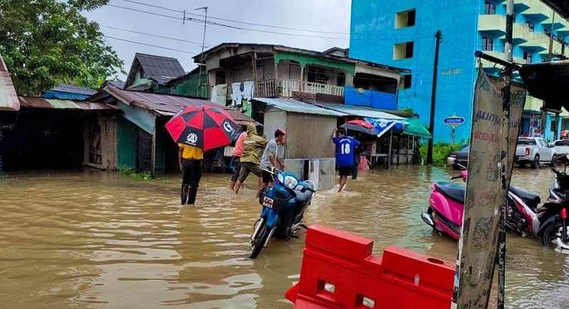 นายปรีชา นวลน้อย นายอำเภอสุไหงโก-ลก จ.นราธิวาส พร้อมนางสุชาดา พันธุ์นรา นายกเทศมนตรีเทศบาลเมืองสุไหงโก-ลก และ พ.ท.ทวีรัตน์ เบญจาทิกุล ผบ.ฉก.นราธิวาส 30 ลงพื้นที่ติดตามสถานการณ์น้ำท่วมจากฝนตกหนักมา 5 วัน ทำให้แม่น้ำสุไหงโก-ลก ล้นตลิ่งเอ่อท่วมชุมชนท่าประปา เขตเทศบาลเมืองสุไหงโก-ลก จำนวน 20 ครัวเรือน ระดับน้ำประมาณ 20 เซนติเมตร และมีแนวโน้มเพิ่มสูงขึ้น เจ้าหน้าที่อาสารักษาดินแดนและเจ้าหน้าที่ฝ่ายป้องกันสาธารณภัย รวมทั้งเจ้าหน้าที่ทหารช่วยประชาชนสิ่งของขึ้นที่สูงไว้ล่วงหน้า ท่ามกลางฝนยังตกเป็นระยะ ท้องฟ้ามืดครึ้ม