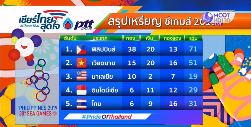 ฟิลิปปินส์ 2 ธ.ค.-สรุปเหรียญทองซีเกมส์ 2019 วันจันทร์ที่ 2 ธันวาคม 2562 ฟิลิปปินส์ เจ้าภาพ ยังนำห่างมี 38 เหรียญทอง ส่วนไทยอยู่อันดับ 5 มี 6 เหรียญทอง 9 เหรียญเงิน 16 หรียญทองแดง.-สำนักข่าวไทย