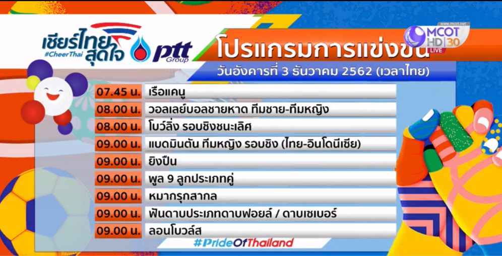 ฟิลิปปินส์ 2 ธ.ค.-โปรแกรมแข่งขันซีเกมส์ 2019 วันพรุ่งนี้ (3 ธ.ค.) ทีมชาติไทยมีลุ้นเหรียญหลายรายการ ไฮไลต์อยู่ที่ฟุตบอลชาย ทีมช้างศึกไทยจะพบกับ ลาว เวลา 15.00 น.ตามเวลาไทย.-สำนักข่าวไทย