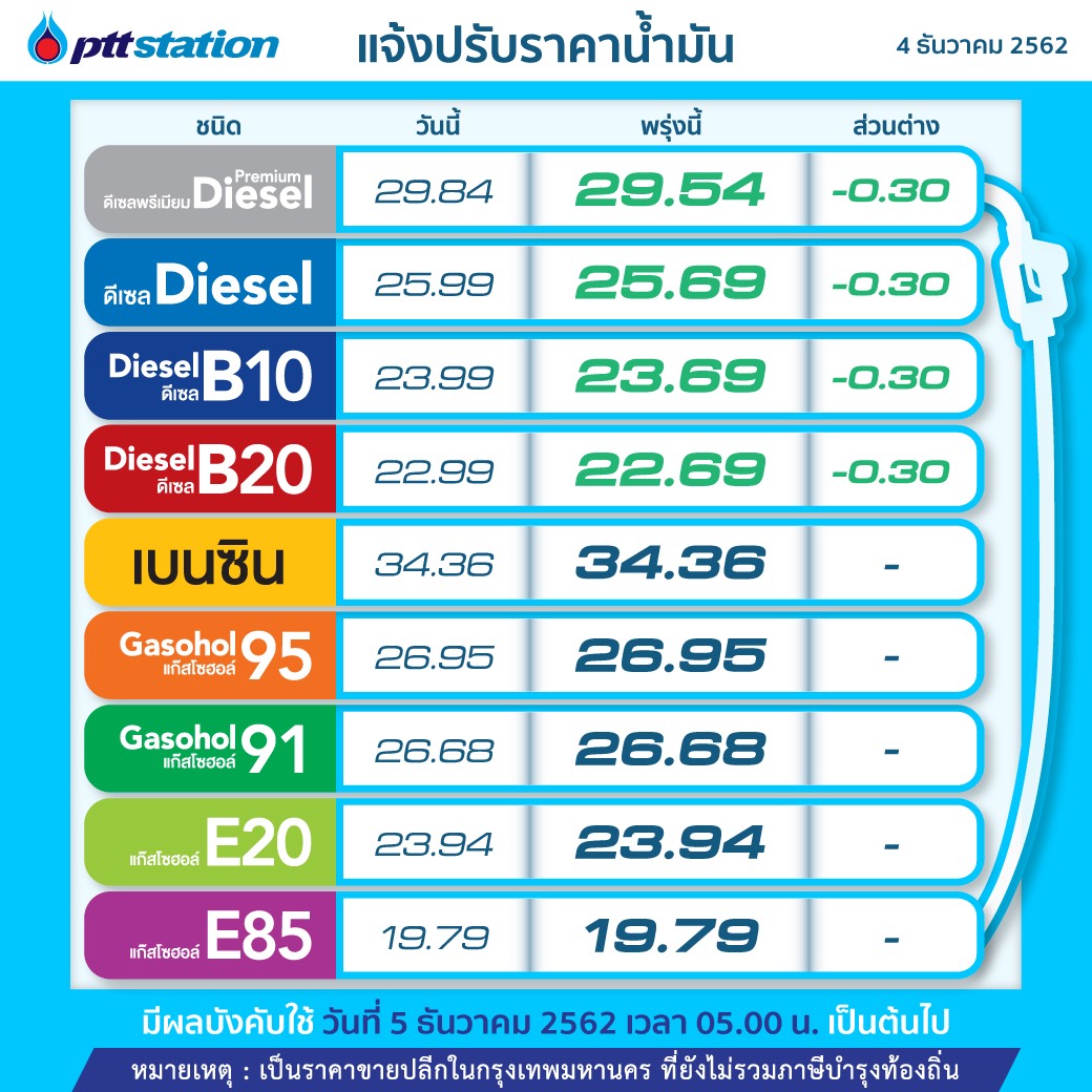 กรุงเทพฯ 4 ธ.ค. – ปตท. – บางจากฯ ปรับราคาขายปลีกน้ำมันกลุ่มดีเซลทุกชนิดลดลง 0.30 บาทต่อลิตร ส่วนกลุ่มเบนซินและแก๊สโซฮอล์คงเดิม มีผล 5 ธ.ค. 2562