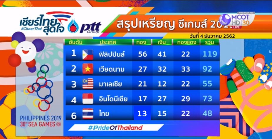 ฟิลิปปินส์ 4 ธ.ค.-สรุปเหรียญซีเกมส์ 2019 วันที่ 4 ธ.ค.62 เจ้าภาพ ฟิลิปปินส์ ยังนำที่ 56 เหรียญทอง ตามมาห่างๆ ด้วยเวียดนาม มี 27 เหรียญทอง ขณะที่ไทยอยู่อันดับ 6 มี 13 เหรียญทอง 15 เหรียญเงิน 22 เหรียญทองแดง.-สำนักข่าวไทย