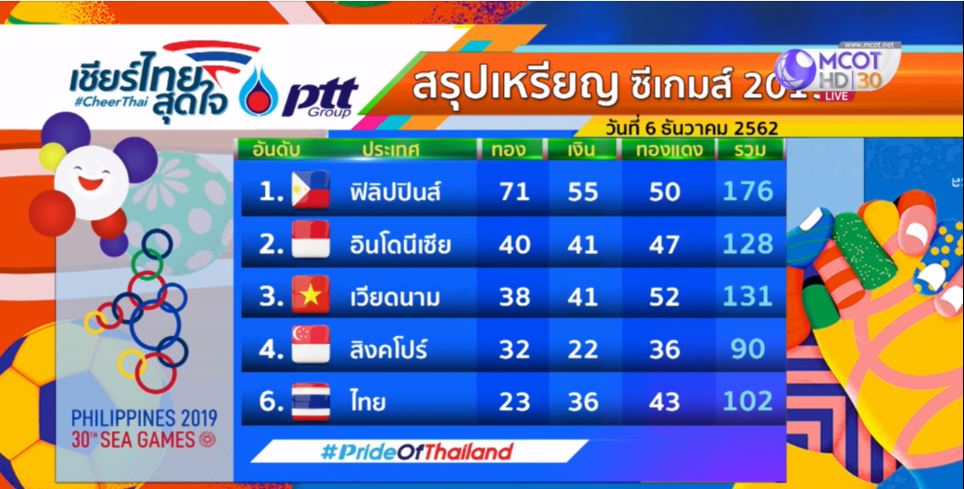 ฟิลิปปินส์ 6 ธ.ค.-สรุปเหรียญซีเกมส์ 2019 วันศุกร์ที่ 6 ธันวาคม 2562 ฟิลิปปินส์ยังนำห่างที่ 71 เหรียญทอง อินโดนีเซียแซงเวียดนามขึ้นมาอยู่อันดับ 2 มี 40 เหรียญทอง ขณะที่ไทยยังอยู่อันดับ 6 มี 23 เหรียญทอง 36 เหรียญเงิน 43 เหรียญทองแดง.-สำนักข่าวไทย