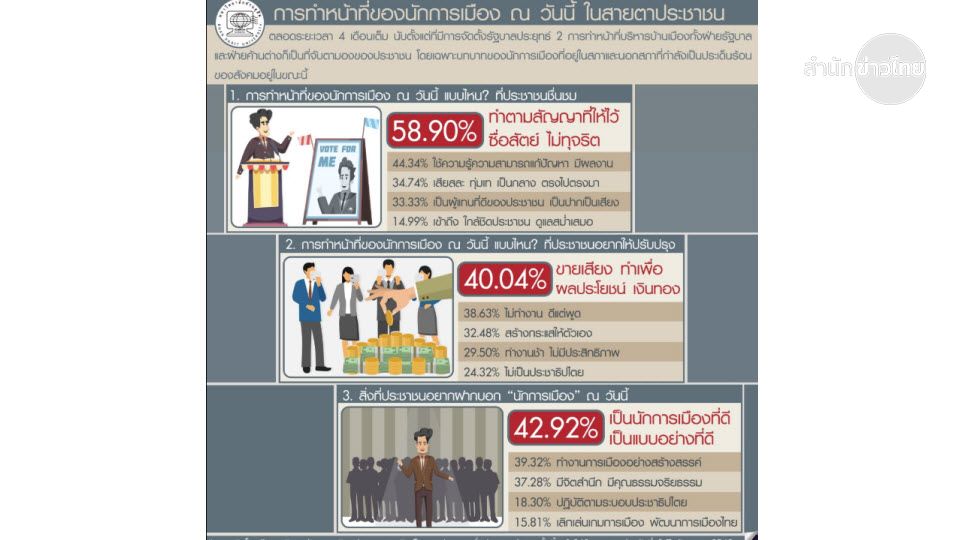 ขณะที่ 5 อันดับแรกของการทำหน้าที่ของนักการเมืองที่ประชาชนอยากให้ปรับปรุง คือ ร้อยละ 40.04 ขายเสียง ทำเพื่อผลประโยชน์ เงินทอง รองลงมา ร้อยละ 38.63 ไม่ทำงาน ดีแต่พูด ร้อยละ 32.48 ทะเลาะเบาะแว้ง สร้างกระแสให้ตัวเอง ร้อยละ 29.50 ทำงานช้า ไม่มีประสิทธิภาพ และร้อยละ 24.32 ไม่เป็นประชาธิปไตย ไม่เคารพเสียงส่วนใหญ่