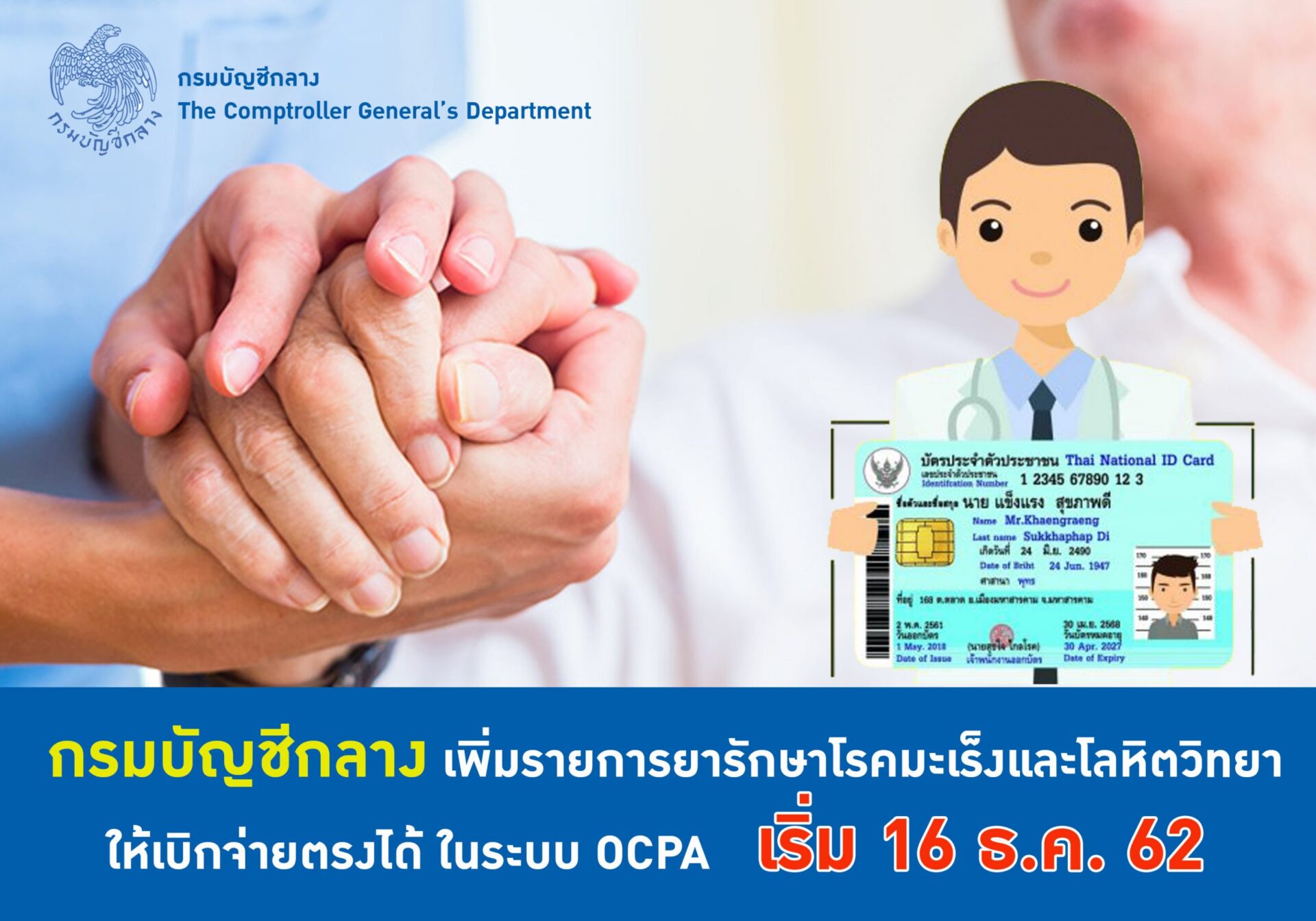 นางสาววิลาวรรณ พยาน้อย รองอธิบดีกรมบัญชีกลาง ในฐานะโฆษกกรมบัญชีกลาง เปิดเผยว่า กรมบัญชีกลางได้ดำเนินการเพิ่มเติมรายการยาสำหรับรักษาโรคมะเร็งและโลหิตวิทยา ในโครงการเบิกจ่ายตรงสำหรับผู้ป่วยโรคมะเร็งและโลหิตวิทยา (ระบบ OCPA) อย่างต่อเนื่อง เพื่อให้ผู้มีสิทธิและบุคคลในครอบครัวที่ป่วยเป็นโรคมะเร็งและโลหิตวิทยาสามารถเบิกจ่ายตรงได้ โดยไม่ต้องทดรองจ่ายเงินไปก่อน โดยล่าสุดกรมบัญชีกลางได้มีการปรับปรุงเงื่อนไขข้อบ่งชี้ในการเบิกจ่ายยา 1 รายการ และเพิ่มเติมรายการยาให้สามารถเบิกจ่ายตรงได้อีก 1 รายการ ซึ่งจะเริ่มใช้สิทธิได้ตั้งแต่วันที่ 16 ธันวาคม 2562 เป็นต้นไป โดยมีรายละเอียด ดังนี้