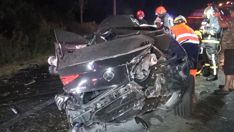 กาญจนบุรี 9 ธ.ค.- กู้ภัยกาญจนบุรีเร่งช่วย 2 นักศึกษาชายบาดเจ็บเมื่อกลางดึก หลังขับเบนซ์ป้ายแดงหักหลบสุนัขจนรถเสียหลักพุ่งข้ามเลนอัดกระบะ 2 คัน เจ็บอีก 2