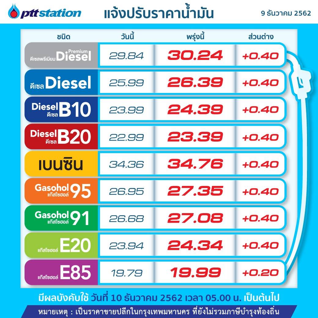 เป็นต้นไป โดยราคาขายปลีก ปตท.ใหม่จะเป็นดังนี้ เบนซิน 34.76 บาท แก๊สโซฮอล์ 95 อยู่ที่ 27.35 บาท E20