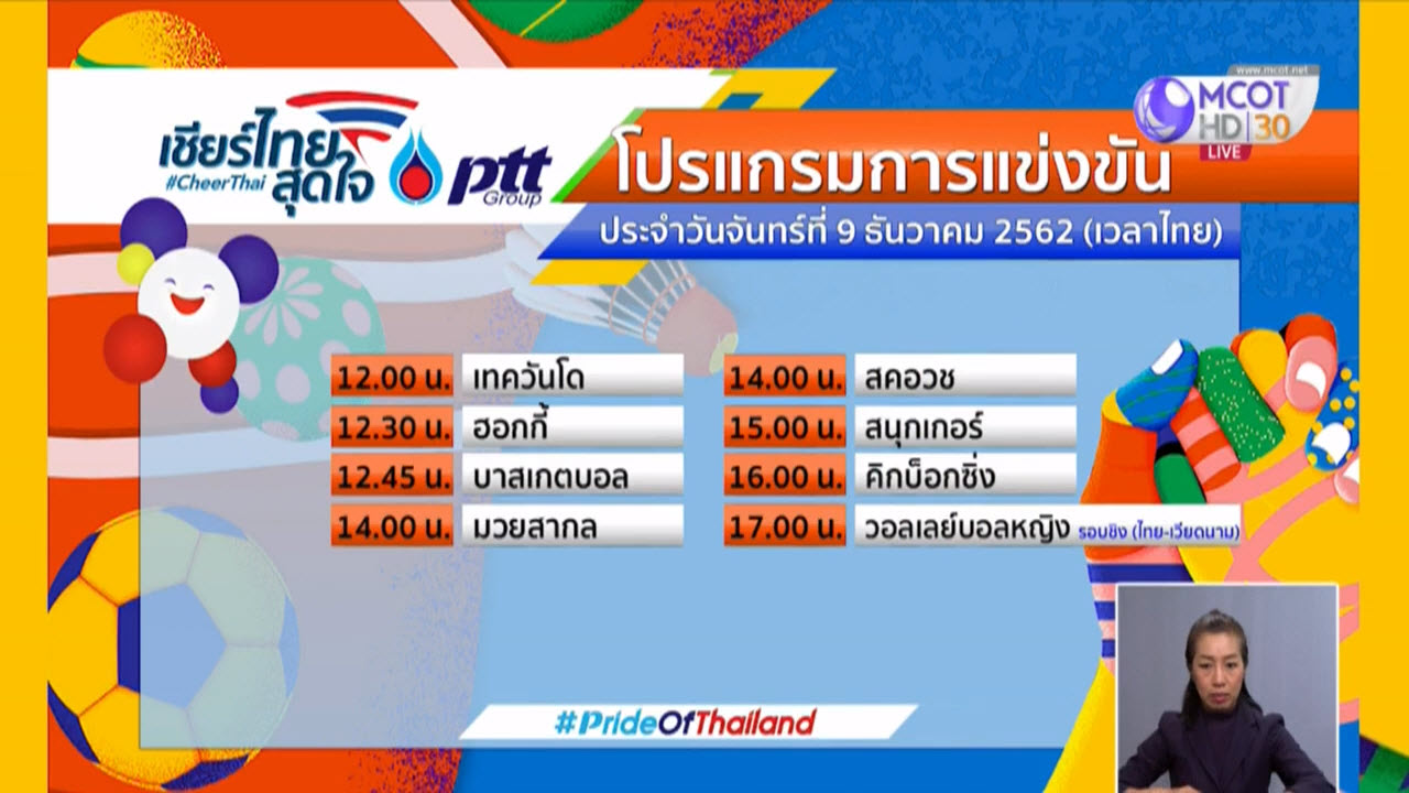 - 17.00 น.วอลเลย์บอลหญิง รอบชิง (ไทย-เวียดนาม)