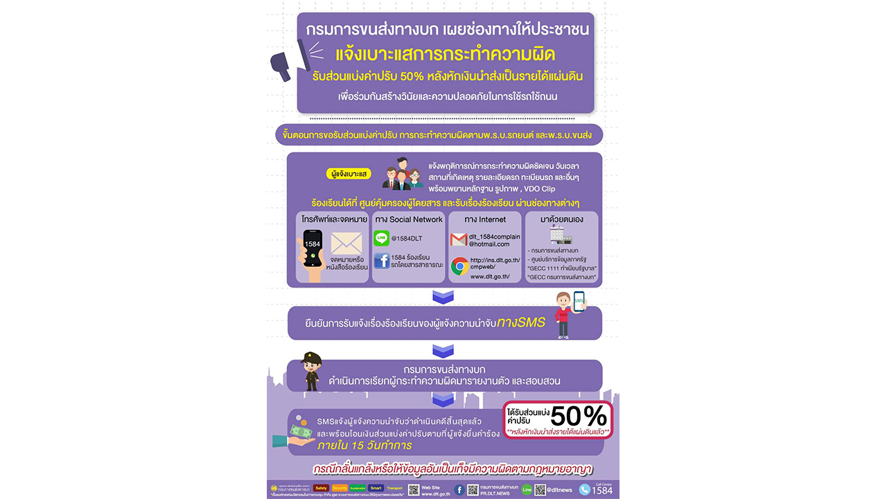 กรุงเทพฯ 9 ธ.ค.- เริ่มแล้ว!! ช่องทางรับแจ้งเบาะแส การกระทำความผิดตามกฎหมายว่าด้วยรถยนต์และกฎหมายว่าด้วยการขนส่งทางบก รับส่วนแบ่งค่าปรับ 50% เพื่อร่วมกันสร้างวินัยและความปลอดภัยในการใช้รถใช้ถนน