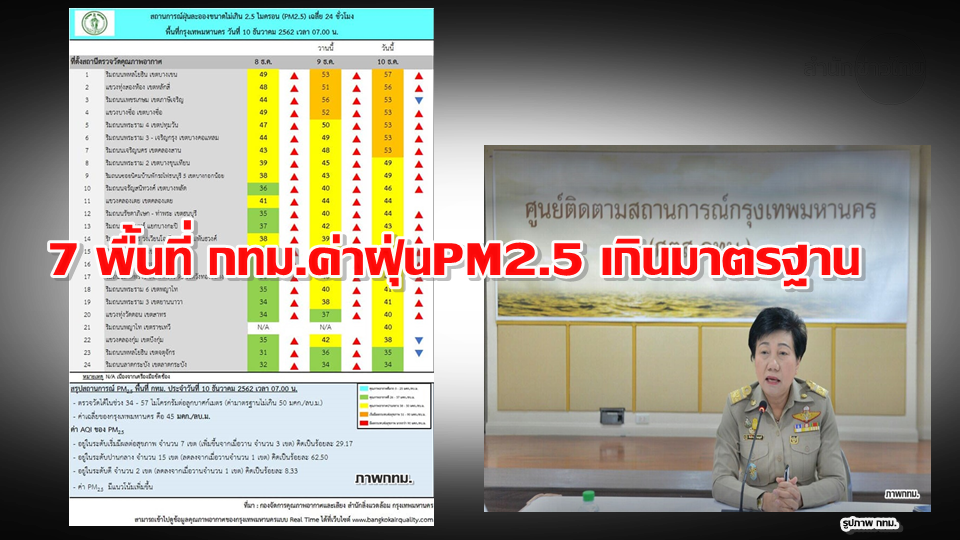 กรุงเทพมหานคร (กทม.) รายงานสถานการณ์ฝุ่นละอองประจำวันนี้ (10 ธ.ค.) ว่า จากการรายงานสถานการณ์ฝุ่นละอองในพื้นที่กรุงเทพมหานคร โดยกองจัดการคุณภาพอากาศและเสียง สำนักสิ่งแวดล้อม กทม. สรุปผลการตรวจวัด PM2.5 ค่าเฉลี่ย 24 ชั่วโมง ตรวจวัดได้ 34-57 ไมโครกรัม/ลูกบาศก์เมตร (มคก./ลบ.ม.) พบว่าเกินมาตรฐาน (มาตรฐานไม่เกิน 50 มคก./ลบ.ม.) จำนวน 7 พื้นที่ คือ