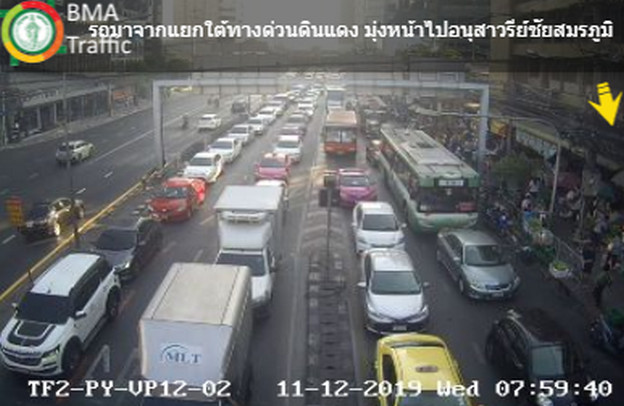 ถนนดินแดง ขาเข้า จากใต้ด่วนดินแดง เข้าถนนราชวิถี – อนุสาวรีย์ชัยสมรภูมิ รถมาก ท้ายแถวนิ่งแยกใต้ด่วนดินแดง กระทบถนนวิภาวดี ขาเข้า ท้ายสะสมแยกลาดพร้าว