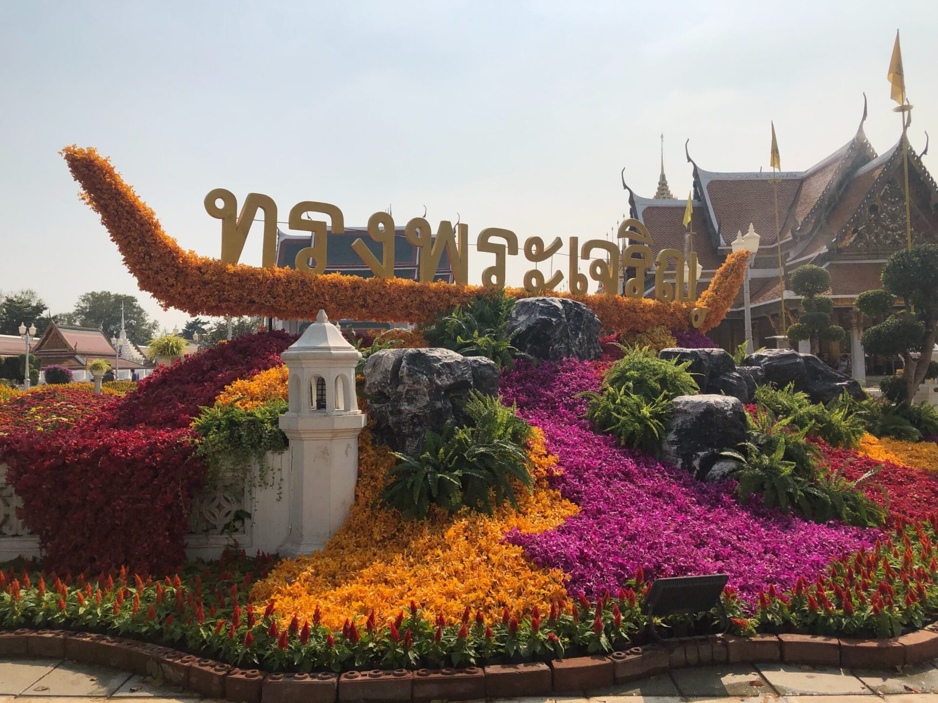 บรรยากาศรอบเกาะรัตนโกสินทร์ ในพื้นการเตรียมความพร้อมในการเสด็จพระราชดำเนินเลียบพระนคร โดยขบวนพยุหยาตราทางชลมารค เนื่องในพระราชพิธีบรมราชาภิเษก พุทธศักราช 2562 ตลอดถนนราชดำเนินกลาง และ บริเวณลานพลับพลามหาเจษฎาบดินทร์ มีการประดับตกแต่งด้วยไม้ดอกไม้ประดับนานาพรรณ ให้สวยงาม สมพระเกียรติ และแต่งเป็นรูปจำลองเรือพระที่นั่งสุพรรณหงส์ ด้วยดอกกล้วยไม้สีเหลืองอร่าม และแซมด้วยดอกกล้วยไม้สีม่วง รอบบริเวณยังมีการประดับอักษร ทรงพระเจริญ โดยหากถ่ายภาพบริเวณจุดนี้ ยังจะได้รับชมความงามของโลหะปราสาทด้านหลังอีกด้วย ส่วนพรรณไม้โดยรอบมีทั้ง ดอกหงอนไก่ ดอกผีเสื้อ กล้วยไม้ บานชื่น สร้างความสดชื่นแก่ผู้ที่สัญจรผ่านไปมา และแม้ว่าช่วงกลางวันอากาศจะค่อยๆ มีอุณหภูมิสูงขึ้น แต่คนที่ผ่านไปมาก็จะเก็บภาพความประทับใจในโทรศัพท์มือถือ