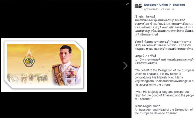 ผู้สื่อข่าวรายงานด้วยว่า เว็บไซต์เฟซบุ๊กคณะผู้แทนสหภาพยุโรปประจำประเทศไทย ได้เผยแพร่สารของนายเฆซุส มิเกล ซันส์ เอกอัครราชทูตและหัวหน้าคณะผู้แทนสหภาพยุโรปประจำประเทศไทย ใจความว่า ในนามของคณะผู้แทนสหภาพยุโรปประจำประเทศไทย ข้าพเจ้าขอร่วมถวายพระพรชัยมงคลแด่สมเด็จพระเจ้าอยู่หัวมหาวชิราลงกรณ บดินทรเทพยวรางกูร เนื่องในพระบรมราชวโรกาสที่พระองค์เสด็จขึ้นครองราชย์ ข้าพเจ้าน้อมถวายพระพรขอให้พระองค์ทรงพระเจริญ และครองราชย์อย่างยิ่งยืนนาน เพื่อความผาสุขของราชอาณาจักรไทยและปวงชนชาวไทย.-สำนักข่าวไทย
