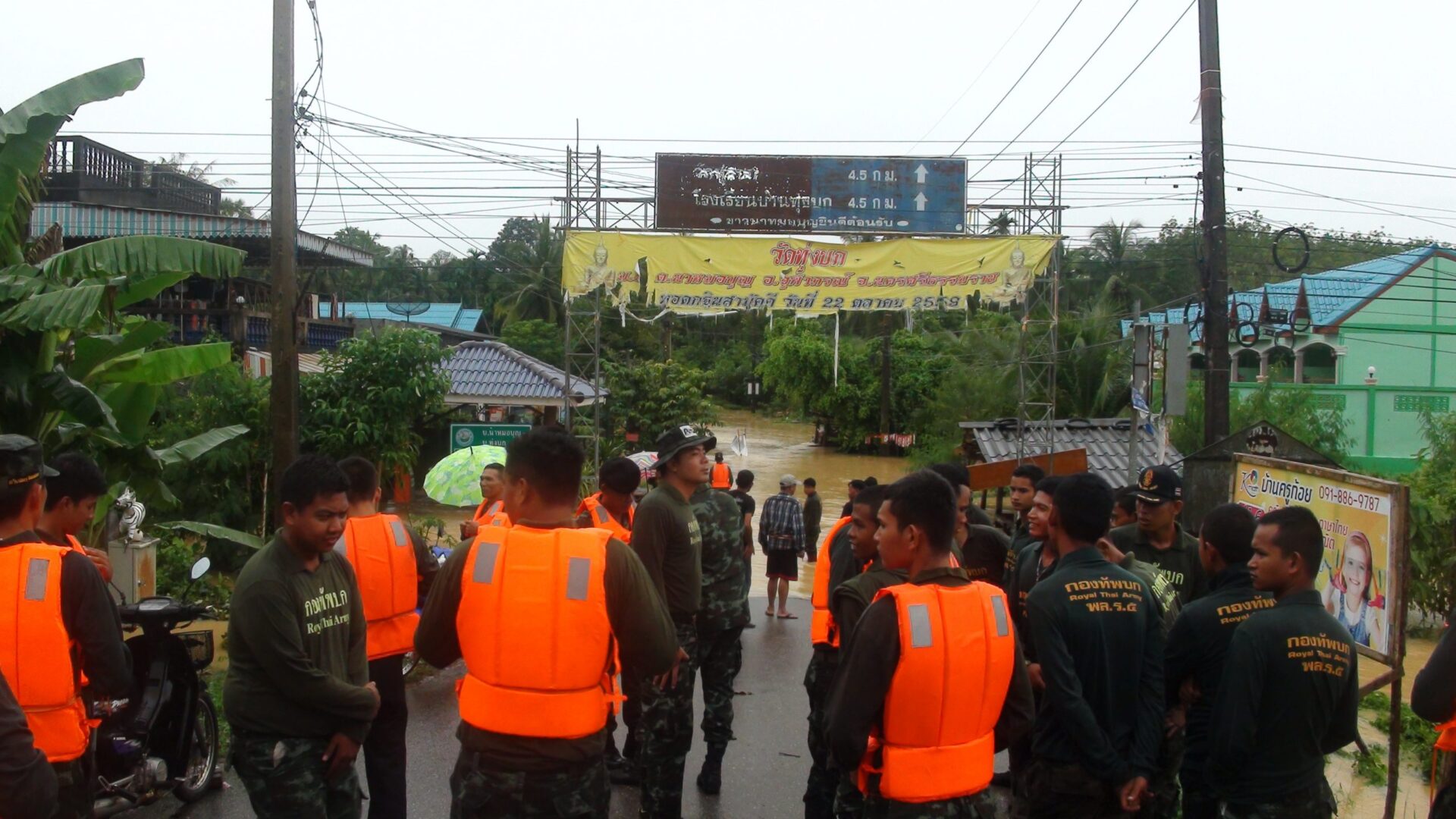 นายไพบูลย์ นาคทิพย์พิมาน นายอำเภอจุฬาภรณ์ จ.นครศรีธรรมราช พร้อมนายสมเกียรติ์ วังบุญคง นายกองค์การบริหารส่วนตำบล (อบต.) นาหมอบุญ และกองทัพภาคที่ 4 ยังคงให้การช่วยเหลือชาวบ้านประสบปัญหาน้ำท่วมสูง 1 เมตร ในพื้นที่ 5 ตำบล จากฝนตกหนักตลอดคืนที่ผ่านมา โดยถนนในหมู่บ้านรถเล็กสัญจรไม่ได้ พื้นที่การเกษตรทั้งสวนยางและสวนไม้ผลถูกน้ำท่วมเช่นกัน ขณะที่โรงเรียนปิดการเรียนการสอนในวันนี้รวมแล้ว 7 โรงเรียน เนื่องจากการเดินทางไม่สะดวก และบ่ายวันนี้ฝนยังคงตกหนักตลอดเวลา