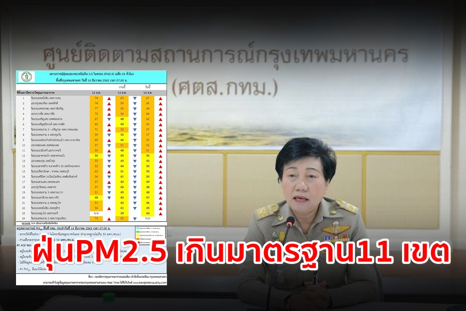 กรุงเทพมหานคร (กทม.) โดยกองจัดการคุณภาพอากาศและเสียง สำนักสิ่งแวดล้อม สรุปผลการตรวจวัด PM 2.5 ณ ช่วงเวลา 05.00-07.00 น. ตรวจวัดได้ 42-67ไมโครกรัม/ลูกบาศก์เมตร , ค่าเฉลี่ย 53 ไมโครกรัม/ลูกบาศก์เมตร , ค่า PM2.5 มีแนวโน้มเพิ่มขึ้นและมีค่าเกินมาตรฐานอยู่ในระดับเริ่มมีผลกระทบต่อสุขภาพ จำนวน 11 เขต คือ เขตปทุมวัน เขตบางคอแหลม เขตบางกะปิ เขตคลองสาน เขตบางกอกน้อย เขตภาษีเจริญ เขตบางเขน เขตบางพลัด เขตคลองเตย เขตบางซื่อ และเขตหลักสี่