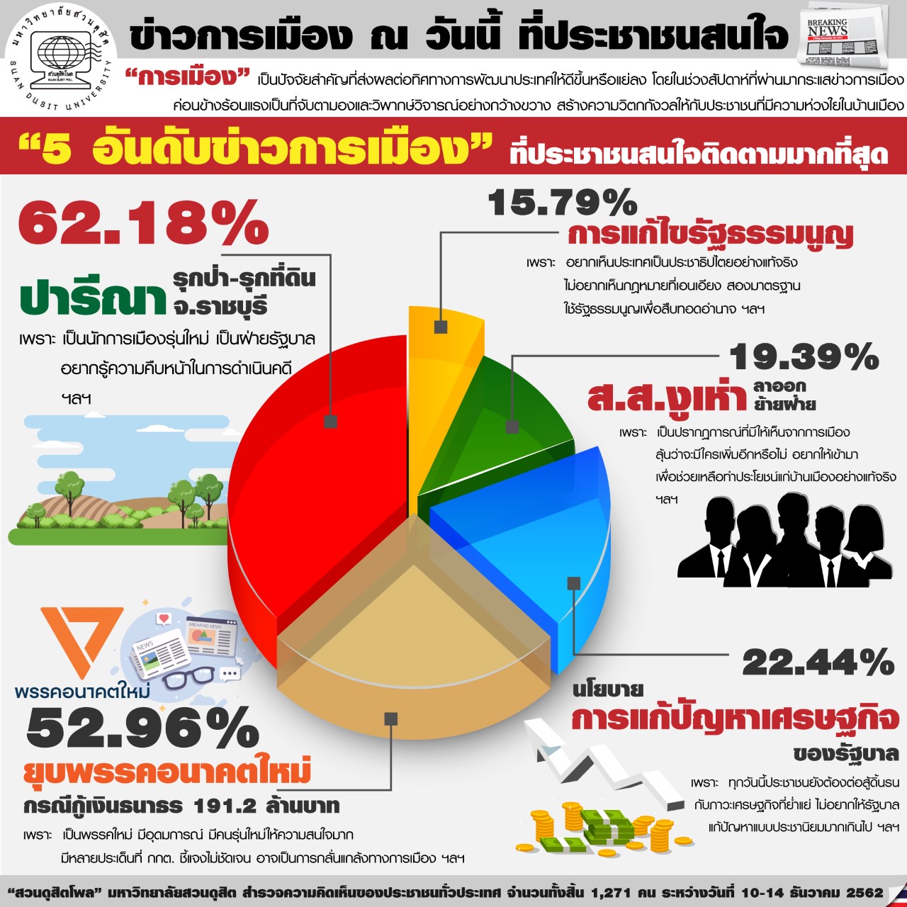 “สวนดุสิตโพล” มหาวิทยาลัยสวนดุสิต สำรวจความคิดเห็นของประชาชนทั่วประเทศ จำนวนทั้งสิ้น 1,271 คน ระหว่างวันที่ 10-14 ธันวาคม 2562 เกี่ยวกับประเด็นการเมือง ที่ประชาชนสนใจติดตามพบว่า 5 อันดับข่าวการเมืองที่ประชาชนสนใจติดตามมากที่สุด อันดับ 1 ร้อยละ 62.18 คือ เรื่องปารีณา รุกป่า – รุกที่ดิน จ.ราชบุรี เพราะอยากรู้ความคืบหน้าคดี เนื่องจากเป็นนักการเมืองรุ่นใหม่เป็นฝ่ายรัฐบาล และเป็นกรณีตัวอย่างให้ประชาชนและคนจนที่ถูกดำเนินคดีลักษณะนี้ และอยากรู่ว่ากฎหมายไทย 2 มาตรฐานจริงหรือไม่ รวมถึงสะท้อนถึงปัญหาคอร์รัปชั่นและใช้อำนาจในทางที่ผิด