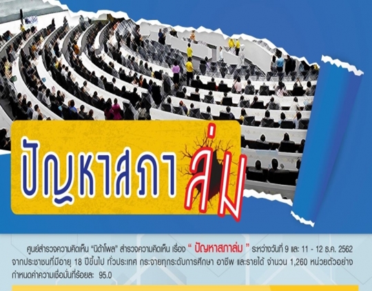 ศูนย์สำรวจความคิดเห็น “นิด้าโพล” สถาบันบัณฑิตพัฒนบริหารศาสตร์ (นิด้า) เปิดเผยผลสำรวจของประชาชน เรื่อง “ปัญหาสภาล่ม” ทำการสำรวจระหว่างวันที่ 9 และ 11 – 12 ธันวาคม 2562 จำนวน 1,260 หน่วยตัวอย่าง เกี่ยวกับการประชุมสภาผู้แทนราษฎรที่ล่มบ่อยครั้ง พบประชาชนส่วนใหญ่ ร้อยละ 54.13 ระบุว่า สภาล่มบ่อยจะทำให้ประชาชนเบื่อและเกิดความเสื่อมศรัทธา รองลงมา ร้อยละ 33.02 ระบุว่า ส.ส. ฝ่ายรัฐบาลและฝ่ายค้าน เล่นเกมการเมืองมากเกินไป ร้อยละ 23.49 ระบุว่า เป็นเรื่องธรรมดาทางการเมือง ซึ่งเกิดขึ้นทุกสมัย ร้อยละ 19.92 ระบุว่า ส.ส. ไม่ค่อยเข้าประชุม ทำงานไม่คุ้มกับเงินเดือน ร้อยละ 7.86 ระบุว่า ประธานวิปพรรคร่วมรัฐบาลไม่มีประสิทธิภาพ ร้อยละ 5.95 ระบุว่า ปัญหาเกิดจากฝ่ายรัฐบาลมีเสียงในสภามากกว่าฝ่ายค้านเพียงนิดเดียว ร้อยละ 4.76 ระบุว่า เป็นความผิดของ ส.ส. ฝ่ายรัฐบาลที่โดดประชุมสภา และร้อยละ 3.10 ระบุว่า เป็นความผิดของ ส.ส. ฝ่ายค้านที่สนใจแต่จะเล่นการเมือง