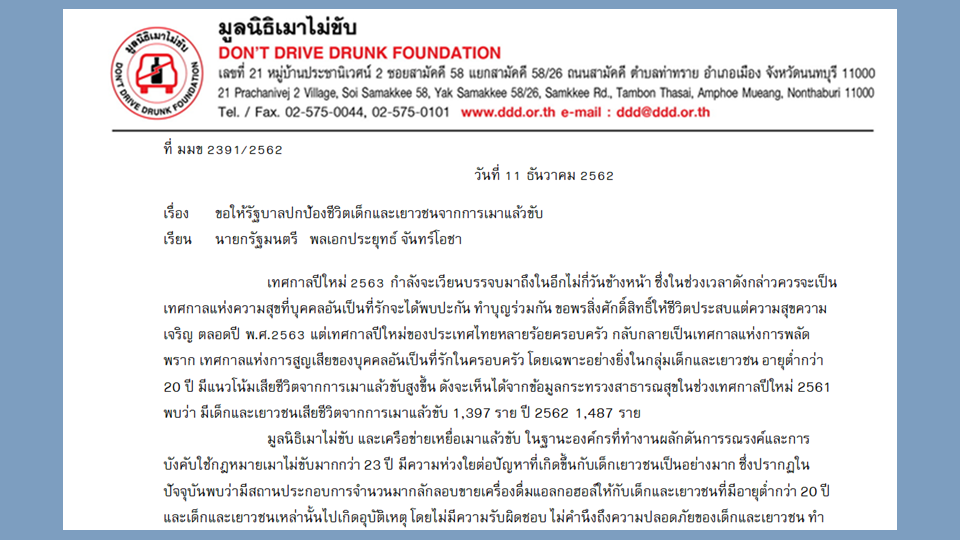 มูลนิธิเมาไม่ขับ และเครือข่ายเหยื่อเมาแล้วขับ ยื่นจดหมายถึงพล.อ.ประยุทธ์ จันทร์โอชา นายกรัฐมนตรี โดยมีข้อความว่า เนื่องในเทศกาลปีใหม่ 2563 กำลังจะเวียนบรรจบมาถึงในอีกไม่กี่วันข้างหน้า ซึ่งในช่วงเวลาดังกล่าวควรจะเป็นเทศกาลแห่งความสุขที่บุคคลอันเป็นที่รักจะได้พบปะกัน ทำบุญร่วมกัน ขอพรสิ่งศักดิ์สิทธิ์ให้ชีวิตประสบแต่ความสุขความเจริญ ตลอดปี พ.ศ.2563 แต่เทศกาลปีใหม่ของประเทศไทยหลายร้อยครอบครัว กลับกลายเป็นเทศกาลแห่งการพลัดพราก เทศกาลแห่งการสูญเสียของบุคคลอันเป็นที่รักในครอบครัว โดยเฉพาะอย่างยิ่งในกลุ่มเด็กและเยาวชน อายุต่ำกว่า 20 ปี มีแนวโน้มเสียชีวิตจากการเมาแล้วขับสูงขึ้น ดังจะเห็นได้จากข้อมูลกระทรวงสาธารณสุขในช่วงเทศกาลปีใหม่ 2561 พบว่า มีเด็กและเยาวชนเสียชีวิตจากการเมาแล้วขับ 1,397 ราย ปี 2562 1,487 ราย