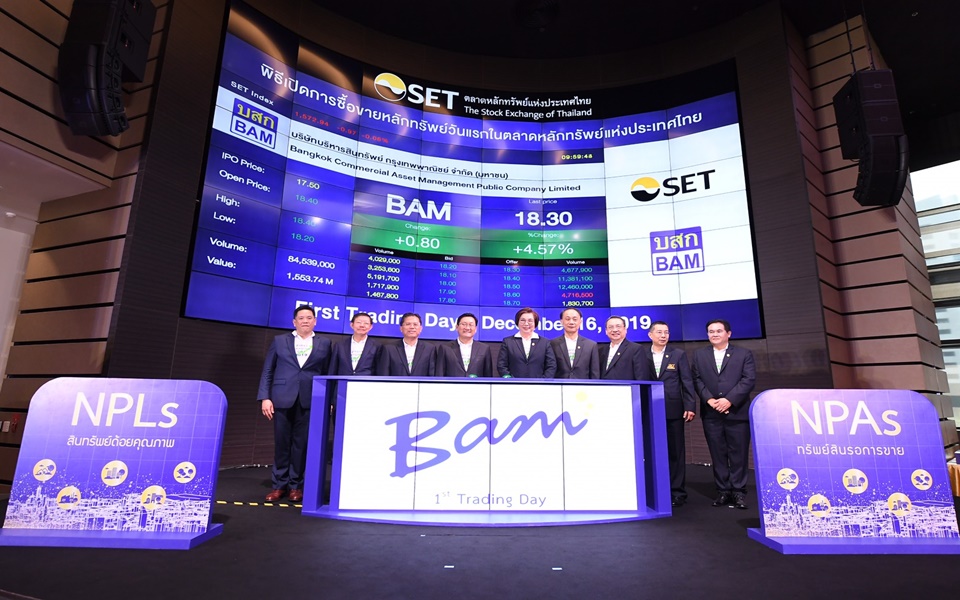 หุ้นบริษัทบริหารสินทรัพย์ กรุงเทพพาณิชย์ จำกัด (มหาชน) หรือ BAM เข้าทำการซื้อขายวันแรกในตลาดหลักทรัพย์แห่งประเทศไทย (ตลท.) เปิดเทรดที่ราคา 18.40 บาท เพิ่มขิ้น 0.90 บาท หรือ 5.14 % จากราคาขาย IPOที่ 17.50 บาทต่อหุ้น