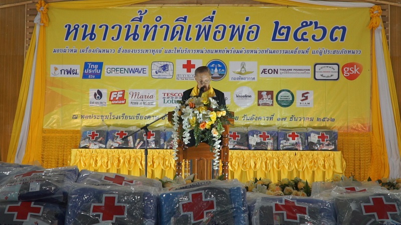 พร้อมกันนี้นายชัยวัฒน์ ชื่นโกสุม ผู้ว่าราชการจังหวัดเลย และคณะเหล่ากาชาดจังหวัดเลย ร่วมในพิธีมอบเครื่องกันหนาวแก่ผู้ประสบภัยหนาว จำนวน 3,500 ชุดเครื่องกันหนาวสำหรับเด็ก 500 ชุด มอบอุปกรณ์กีฬา เครื่องทำน้ำเย็น ยาเวชภัณฑ์สำหรับห้องพยาบาลโรงเรียนในชนบท ให้บริการตรวจรักษาโรคทั่วไป และโรคทันตกรรม พร้อมให้ความรู้ด้านสุขศึกษาโดยไม่คิดค่าใช้จ่าย นอกจากนี้ ยังเยี่ยมบนผู้ด้อยโอกาส ผู้พิการ เพื่อมอบเครื่องกันหนาวและตรวจสุขภาพแก่ผู้สูงอายุและผู้พิการ จำนวน 30 ครอบครัวต่อวัน