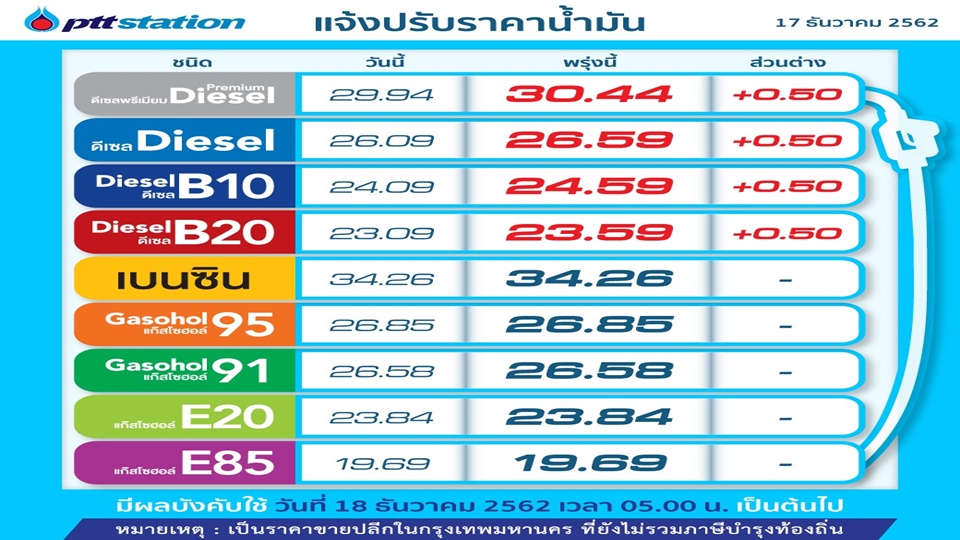 กรุงเทพฯ 17 ธ.ค. – ปตท.-บางจากฯ ปรับราคาขายปลีกกลุ่มดีเซล เพิ่มขึ้น 50 สต./ลิตร ส่วนเบนซิน-แก๊สโซฮอล์คงเดิม มีผล 18 ธ.ค.นี้