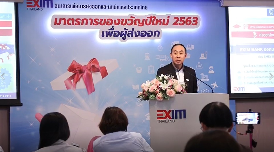 นายพิศิษฐ์ เสรีวิวัฒนา กรรมการผู้จัดการ ธนาคารเพื่อการส่งออกและนำเข้าแห่งประเทศไทย (EXIM BANK) เปิดเผยว่า จากภาวะเศรษฐกิจโลกขยายตัวเพียงร้อยละ 3 และการค้าโลกขยายตัวต่ำสุดในรอบ 10 ปี ร้อยละ 1.1 ในปี 2562 และจากเงินเฟ้อ ดอกเบี้ยอยู่ในระดับต่ำอย่างต่อเนื่องทั่วโลก การค้าขายไปต่างประเทศประสบความยากลำบาก ประกอบกับคู่แข่งมีจำนวนเพิ่มมากขึ้น ปัจจุบันการส่งออกปี 2562 มีแนวโน้มจะหดตัวครั้งแรกในรอบ 4 ปี คาดว่าหดตัวร้อยละ 2.0 และคาดว่าการส่งออกปี 2563 จะกลับมาขยายตัวได้อีกครั้งร้อยละ 0-2 EXIM BANK จึงออกมาตรการปลายปี 2562 เพื่อช่วยผู้ส่งออกไทย คาดว่าการส่งออกจะกลับมาฟื้นตัวอีกครั้งปี 2563 จากปัจจัยบวก 3 ประการ ได้แก่ 1.ศักยภาพของสินค้าไทยทั้งสินค้าเกษตรและเกษตรแปรรูปที่ได้มาตรฐานสากล และสินค้าที่ตอบสนองเมกะเทรนด์โลก รองรับพฤติกรรมผู้บริโภคสมัยใหม่ ทั้งสินค้าเครื่องสำอาง เครื่องประดับ เครื่องมือแพทย์ เภสัชภัณฑ์ เครื่องใช้ไฟฟ้า และรถจักรยานยนต์ 2.การกระจายตลาดจากตลาดเดิมและตลาดใหม่