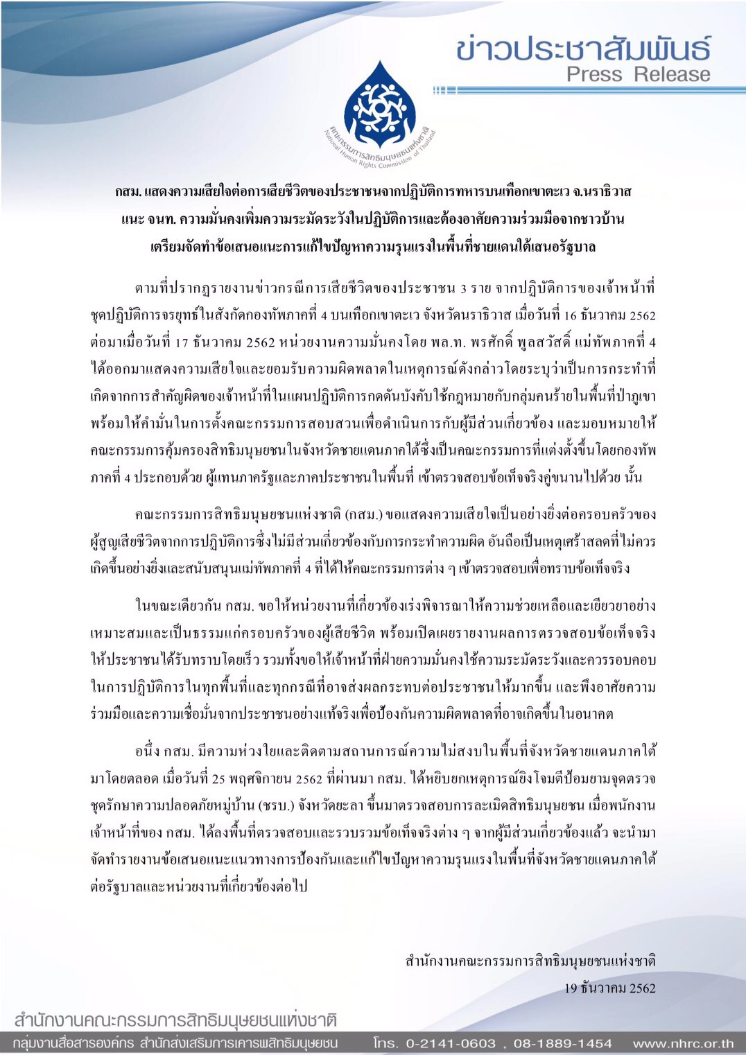วันนี้ (19 ธ.ค.) คณะกรรมการสิทธิมนุษยชนแห่งชาติได้ออกแถลงแสดงความเสียใจต่อกรณีการเสียชีวิตของประชาชน 3 ราย จากปฏิบัติการของเจ้าหน้าที่ชุดปฏิบัติการจรยุทธ์ในสังกัดกองทัพภาคที่ 4 บนเทือกเขาตะเว จ.นราธิวาส เมื่อวันที่ 16 ธ.ค. 62 และ พล.ท.พรศักดิ์ พูลสวัสดิ์ แม่ทัพภาคที่ 4 ได้ออกมายอมรับความผิดพลาดในเหตุการณ์ดังกล่าว