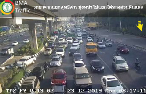 ถนนวิภาวดี – รังสิต ขาเข้า จากสุทธิสาร เข้าใต้ด่วนดินแดง รถมาก เคลื่อนตัวช้า ช่องทางด่วนและคู่ขนาน ท้ายแถวหน้าบริษัทการบินไทย สำนักงานใหญ่