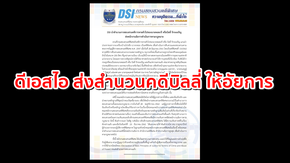 ทั้งนี้ พนักงานสอบสวนคดีพิเศษ ได้แจ้งผลกระบวนการสอบสวน แนะนำให้ข้อมูลและความช่วยเหลือกับผู้เสียหาย ตามปฏิญญาว่าด้วยหลักความยุติธรรมขั้นพื้นฐานสำหรับผู้เสียหายหรือเหยื่ออาชญากรรม และการใช้อำนาจโดยมิชอบ (Declaration of Basic Principles of Justice for Victims of Crime and Abuse of Power) ก่อนส่งสำนวนการสอบสวนแล้ว .-สำนักข่าวไทย