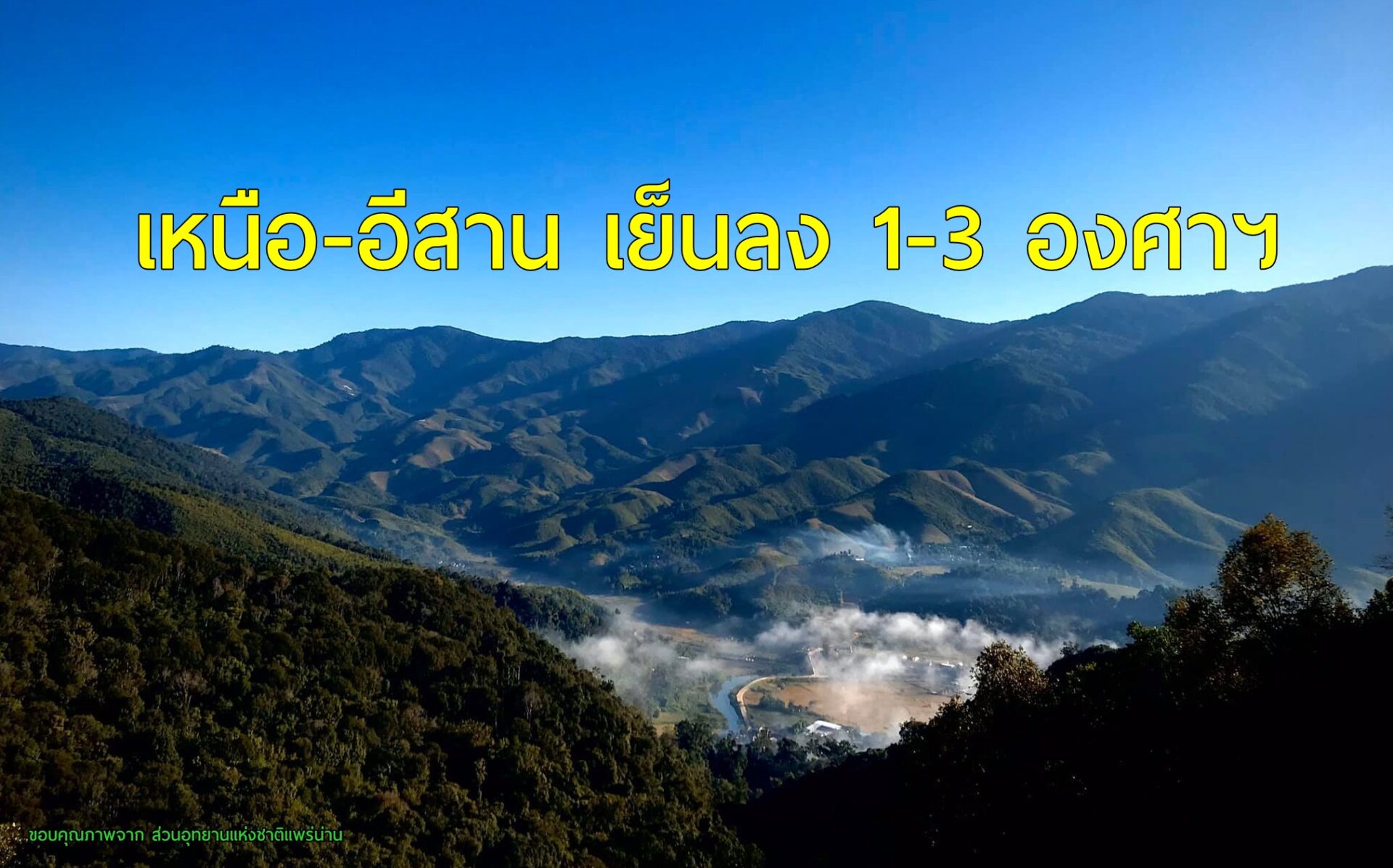 ภาคตะวันออกเฉียงเหนือ บริเวณพื้นราบอากาศเย็น กับมีหมอกในตอนเช้า ตอนบนของภาคอุณหภูมิจะลดลง 1-2 องศาเซลเซียส อุณหภูมิต่ำสุด 16-20 องศาเซลเซียส อุณหภูมิสูงสุด 32-33 องศาเซลเซียส บริเวณยอดภู มีอากาศหนาว อุณหภูมิต่ำสุด 9-13 องศาเซลเซียส ลมตะวันออกเฉียงเหนือ ความเร็ว 10-25 กม./ชม.