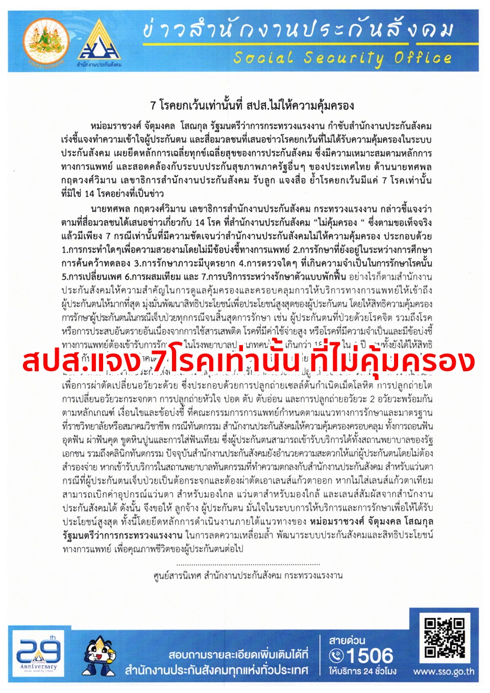 สปส. 27 ธ.ค.-สำนักงานประกันสังคม แจงสื่อ ย้ำโรคยกเว้น มีแค่ 7 โรคเท่านั้น ที่ไม่ให้ความคุ้มครองผู้ประกันตน ไม่ใช่ 14 โรคตามที่เป็นข่าว