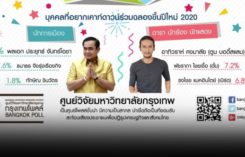 BANGKOK, Dec 27 (TNA) – People want to spend their New Year countdown moment with Prime Minister Prayut Chan-o-cha and rocker Artiwara Kongmalai, aka Toon Body Slam, according to a survey by Bangkok University.
