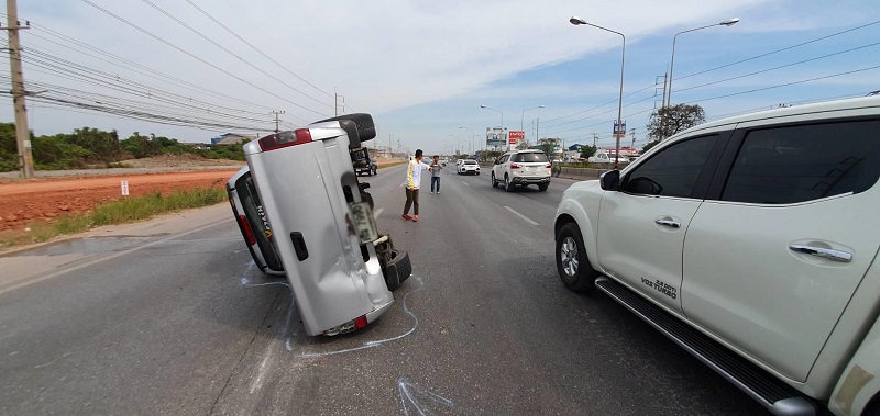 สมุทรสาคร 1 ม.ค.- เกิดอุบัติเหตุย่านถนนพระราม 2 สมุทรสาคร กระบะเสียหลักพลิกตะแคงบาดเจ็บ 5 หลังชนเก๋งดำ เคราะห์ดีหญิงคนขับปลอดภัย