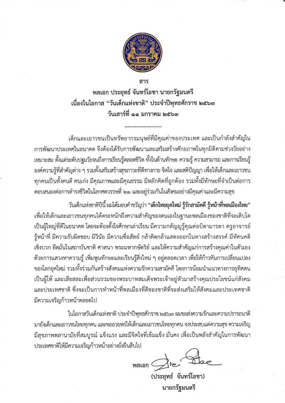 นายประเสริฐ บุญเรือง ปลัดกระทรวงศึกษาธิการ กล่าวว่า พล.อ.ประยุทธ์ จันทร์โอชา นายกรัฐมนตรี ได้มอบสารเนื่องในโอกาสวันเด็กแห่งชาติ ประจำปี 2563 ว่า เด็กและเยาวชนเป็นทรัพยากรที่มีคุณค่าของประเทศ และเป็นกำลังสำคัญในการพัฒนาประเทศในอนาคต จึงต้องได้รับการพัฒนาและเสริมสร้างศักยภาพในทุกมิติตามช่วงวัยอย่างเหมาะสม ตั้งแต่ระดับปฐมวัยจนถึงการเรียนรู้ตลอดชีวิตทั้งในด้านทักษะความรู้ ความสามารถ และการเรียนรู้องค์ความรู้ที่สำคัญต่างๆ รวมทั้งเสริมสร้างสุขภาวะที่ดีทางกาย จิตใจ และสติปัญญาเพื่อให้เด็กและเยาวชนทุกคนเป็นทั้งคนดี คนเก่ง มีคุณภาพและมีคุณธรรม มีหลักคิดที่ถูกต้อง รวมทั้งมีทักษะที่จำเป็นต่อการตอบสนองต่อการดำรงชีวิตในโลกศตวรรษที่ 21 และอยู่ร่วมกันในสังคมอย่างมีคุณค่า และมีความสุข