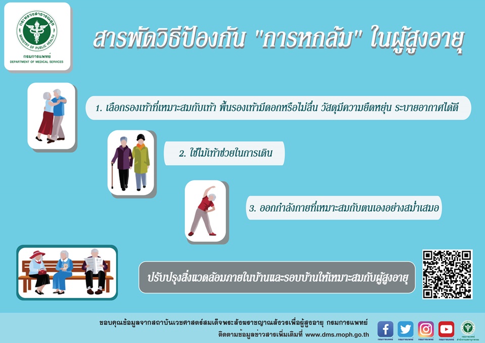 กรมการแพทย์ 3 ม.ค.-แพทย์ชี้ปัญหาการหกล้มในผู้สูงอายุมีอันตรายกว่าที่คิด อาจเกิดอาการบาดเจ็บเล็กน้อย จนถึงบาดเจ็บรุนแรงถึงขั้นเสียชีวิต แนะเลือกรองเท้าที่เหมาะสม ใช้ไม้เท้าช่วยในการเดิน ออกกำลังกายที่เหมาะสมอย่างสม่ำเสมอ และปรับปรุงสิ่งแวดล้อมภายในบ้านให้เหมาะสม