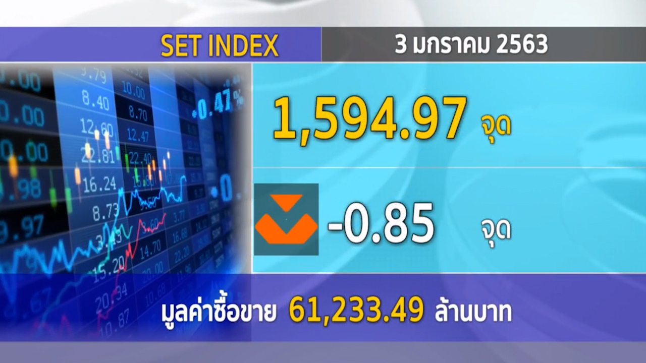 กรุงเทพฯ 3 ม.ค.-ตลาดหลักทรัพย์ปิดวันนี้ที่ระดับ 1,594.97 จุด ลดลง 0.85 จุด มูลค่าการซื้อขาย 61,278.34 ล้านบาท ตลาดกังวลสถานการณ์ตึงเครียดในตะวันออกกลาง