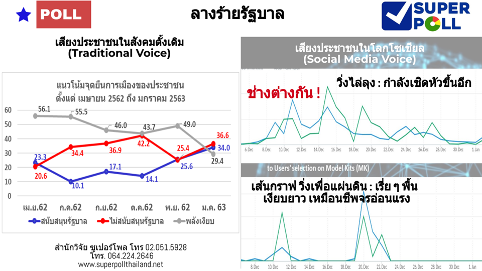 กรุงเทพฯ 4 ม.ค.-สำนักวิจัยซูเปอร์โพล นำเสนอเรื่องลางร้ายรัฐบาล พลังเงียบลดลงอย่างมีนัยสำคัญ ขณะที่ประชาชนสนับสนุนรัฐบาล ร้อยละ 34.0 ไม่สนับสนุนรัฐบาล 36.6 พบการสื่อสารของกลุ่มเคลื่อนไหว วิ่งไล่ลุง เข้าถึงคนในโลกโซเชียล 7,278,575 คน ส่วนการสื่อสารของนายกฯ เกี่ยวกับกิจกรรม วิ่งเพื่อแผ่นดิน เข้าถึงคนในโลกโซเชียล 589,224 คน