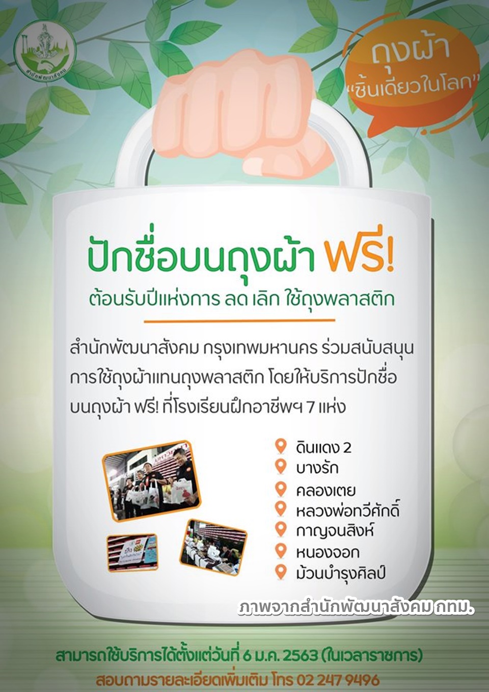 สำหรับผู้ที่สนใจปักชื่อบนถุงผ้าไม่ว่าจะเป็นชื่อจริงหรือชื่อเล่น สามารถใช้บริการได้ฟรีที่โรงเรียนฝึกอาชีพของกรุงเทพมหานครทั้ง 7 แห่ง ตั้งแต่วันที่ 6 ม.ค.63 เป็นต้นไป (ในเวลาราชการ) ใกล้ที่ไหนนำถุงผ้าไปใช้บริการกันได้ ซึ่งนอกจากจะเป็นการช่วยลดขยะพลาสติกแล้วยังได้ใช้ถุงผ้าที่เป็นเอกลักษณ์และไม่เหมือนใครอีกด้วย.-สำนักข่าวไทย