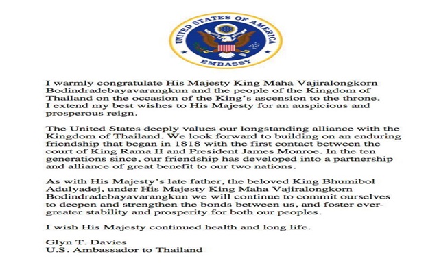 “เฉกเช่นเดียวกับในรัชสมัยของพระบาทสมเด็จพระปรมินทรมหาภูมิพลอดุลยเดช สมเด็จพระบรมชนกนาถผู้ทรงเป็นที่รักยิ่งของปวงชน สหรัฐอเมริกาจะยังคงมุ่งมั่นพัฒนาสายสัมพันธ์นี้ภายใต้พระบารมีในสมเด็จพระเจ้าอยู่หัวมหาวชิราลงกรณ บดินทรเทพยวรางกูร ให้กระชับแน่นแฟ้นยิ่งขึ้นเพื่อเสถียรภาพและความเจริญรุ่งเรืองแห่งประชาชนของทั้งสองประเทศ ข้าพระพุทธเจ้าขอกราบบังคมทูลพระกรุณาถวายพระพรชัยมงคลเพื่อสมเด็จพระเจ้าอยู่หัวมหาวชิราลงกรณ บดินทรเทพยวรางกูร มีพระพลานามัยสมบูรณ์และทรงพระเกษมสำราญยิ่งยืนนาน ควรมิควรแล้วแต่จะทรงพระกรุณาโปรดเกล้าโปรดกระหม่อม ข้าพระพุทธเจ้านายกลิน ที. เดวีส์ เอกอัครราชทูตสหรัฐอเมริกาประจำประเทศไทย”.-สำนักข่าวไทย