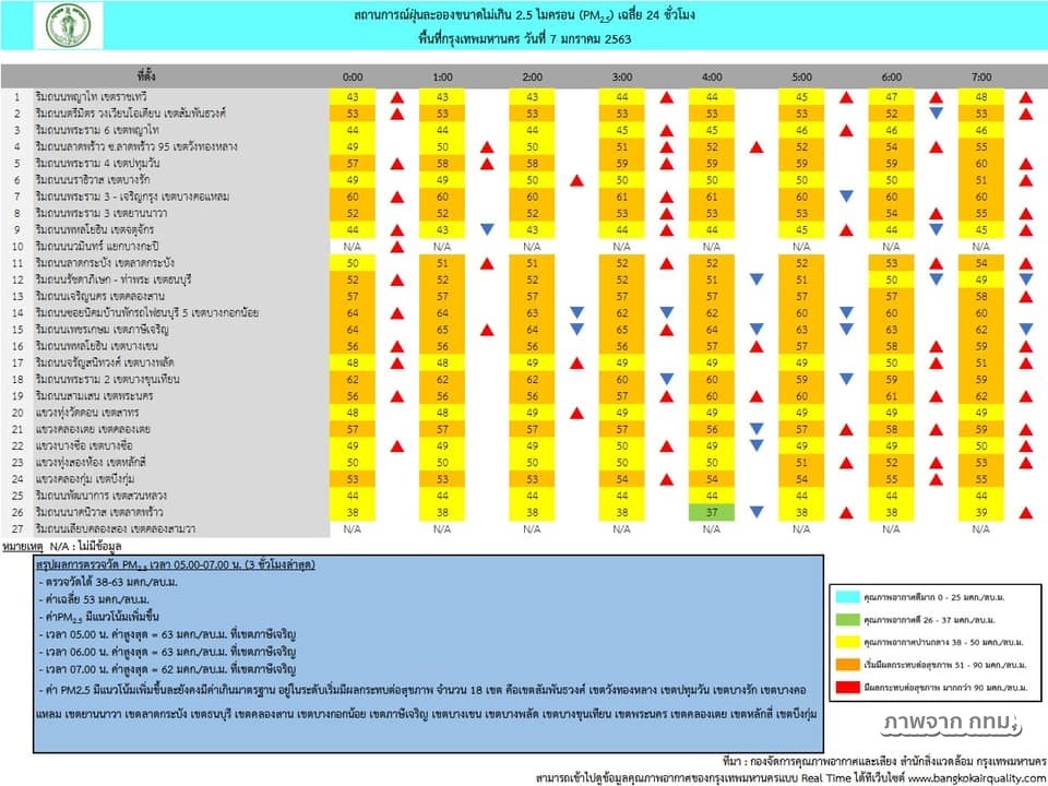 รายงานสถานการณ์ฝุ่นละอองในพื้นที่กรุงเทพมหานคร โดยกองจัดการคุณภาพอากาศและเสียง สำนักสิ่งแวดล้อม กทม. วันนี้ (7ม.ค.) สรุปผลการตรวจวัด PM2.5 น ค่าเฉลี่ย 24 ชั่วโมง ตรวจวัดได้ 39-62 ไมโครกรัม/ลูกบาศก์เมตร (มคก./ลบ.ม.) พบว่าเกินมาตรฐาน (มาตรฐานไม่เกิน 50 มคก./ลบ.ม.) จำนวน 17 พื้นที่ คือ