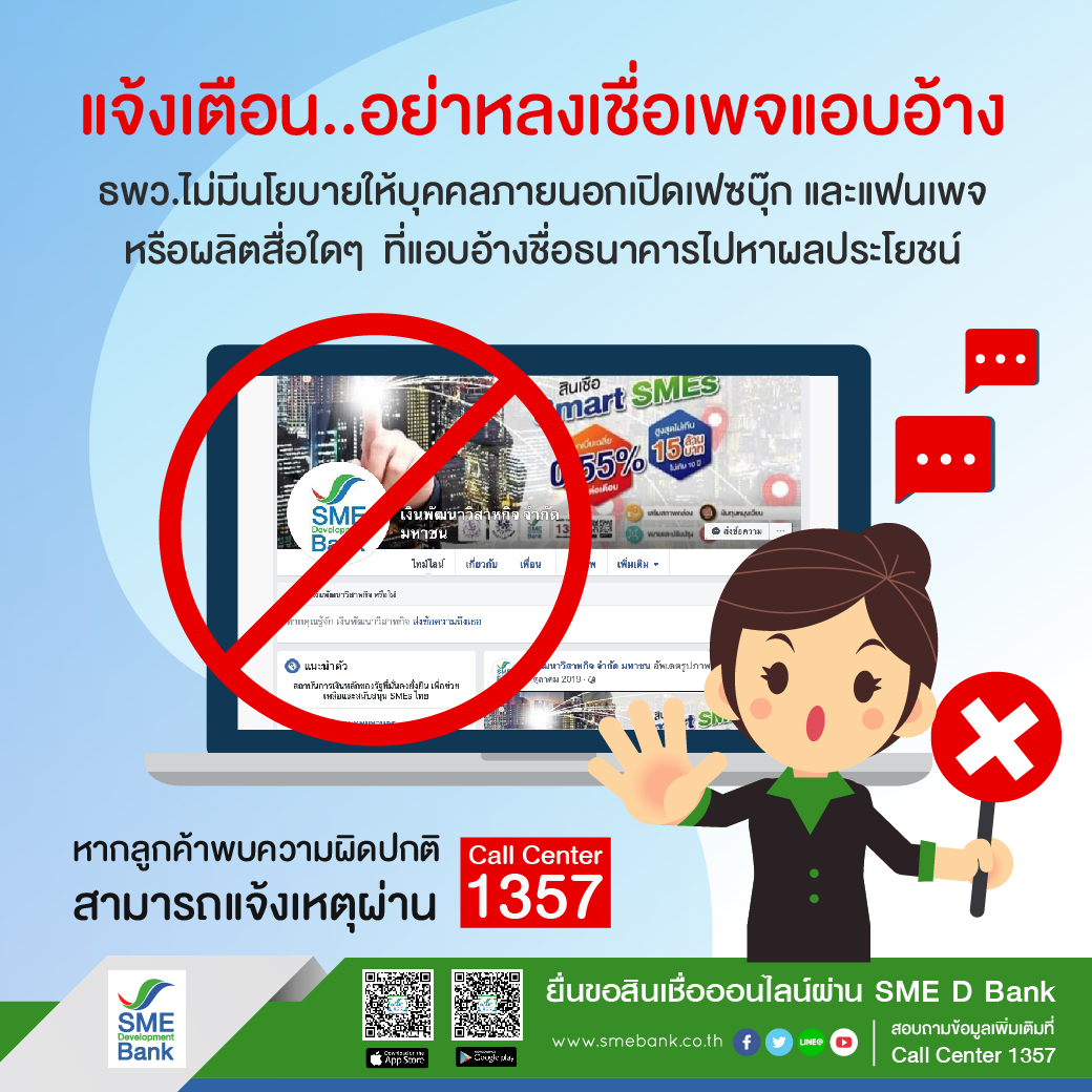 (https://web.facebook.com/SMEDevelopmentBank) และเว็บไซต์ www.smebank.co.th เท่านั้น หากผู้ประกอบการพบเจอ Facebook