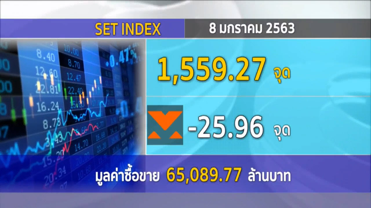 ผู้สื่อข่าวรายงานว่าดัชนีตลาดหลักทรัพย์ฯ ปิดวันนี้ (8 ม.ค.) ที่ระดับ 1,559.27 จุด ลดลง 25.96 จุด หรือ 1.64%  มูลค่าการซื้อขาย 65,089.77 ล้านบาท โดยดัชนีเคลื่อนไหวแดนลบตลอดทั้งวัน ทำระดับสูงสุด 1,572.03 จุด และต่ำสุด 1,555.75 จุด .-สำนักข่าวไทย