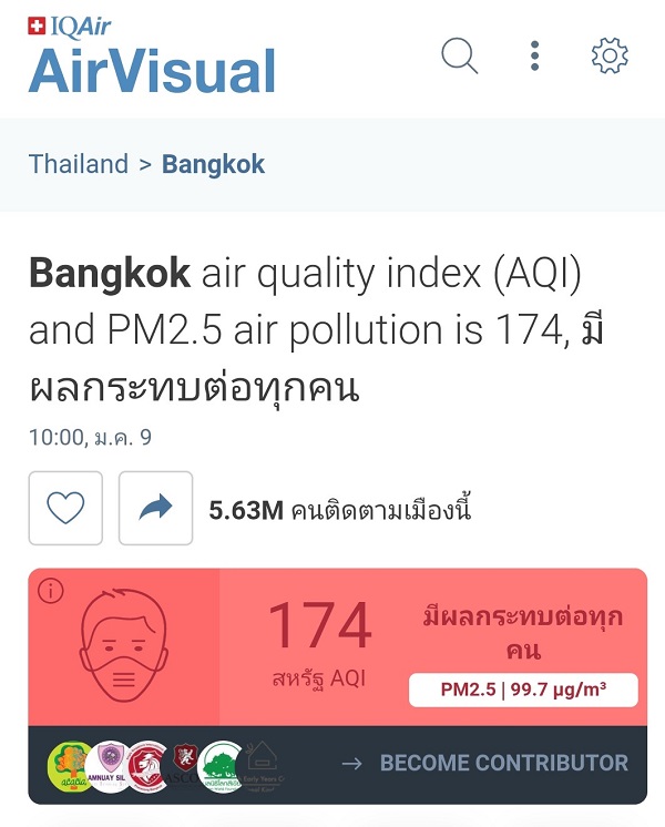 BANGKOK, Jan 9 (TNA) – Bangkok was ranked the world’s eight worst air quality on Thursday morning on AirVisual, a popular application, monitoring the world’s air quality.