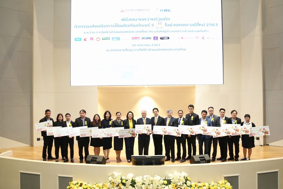 นนทบุรี 10 ม.ค. – การไฟฟ้าฝ่ายผลิตแห่งประเทศไทย (กฟผ.) ลงนามความร่วมมือกิจกรรมส่งเสริมการใช้ผลิตภัณฑ์เบอร์ 5 กับบริษัทผู้ประกอบการห้างสรรพสินค้า 14 ราย เพื่อส่งมอบของขวัญปีใหม่และส่งความสุขให้กับประชาชนทั่วประเทศด้วยการแจกคูปองลดราคา 300 บาท