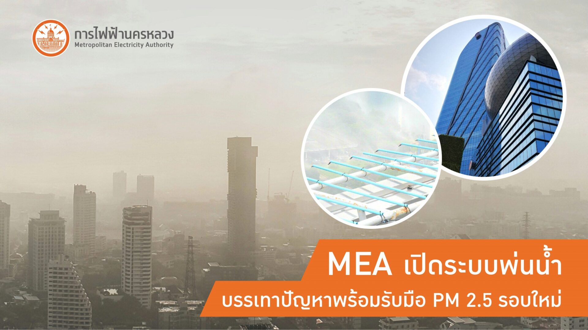 MEA ในฐานะหน่วยงานรัฐวิสาหกิจสังกัดกระทรวงมหาดไทย มีความตระหนักในการมีส่วนร่วมเพื่อแก้ไขปัญหาสิ่งแวดล้อม จึงเริ่มเปิดใช้ระบบพ่นละอองน้ำลดฝุ่น PM 2.5 บนดาดฟ้าอาคารวัฒนวิภาส การไฟฟ้านครหลวง สำนักงานใหญ่ คลองเตย อีกครั้ง โดยอาคารดังกล่าวเป็นอาคารสูง 25 ชั้น ตั้งอยู่ริมถนนพระราม 4 และได้มีการติดตั้งระบบพ่นด้วยหัวฉีดละอองน้ำมากกว่า 500 หัวฉีดบนดาดฟ้า เพื่อใช้ดำเนินการพ่นละอองน้ำเพื่อลดปริมาณฝุ่น PM 2.5 ตั้งแต่ปี 2562 ผ่านมา และกลับมาเปิดระบบอีกครั้งในวันนี้ เพื่อบรรเทาปัญหาฝุ่น PM 2.5 จนกว่าจะคลี่คลาย ทั้งนี้ สามารถตรวจสอบรายงานสถานการณ์และคุณภาพอากาศประเทศไทยแบบเรียลไทม์ได้ทางเว็บไซต์ http://air4thai.pcd.go.th/webV2/