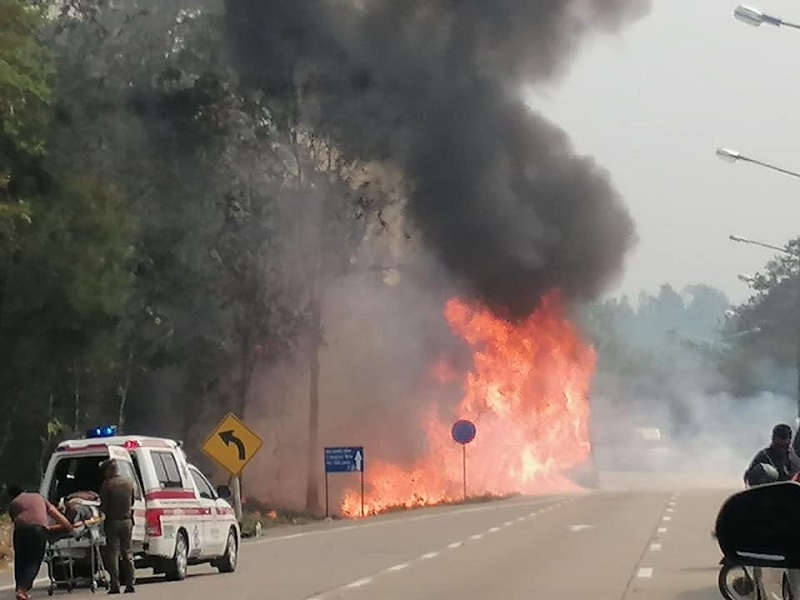 ลำปาง 13 ม.ค.- สิบล้อบรรทุกถังเปล่าสารเคมีระบบเบรกขัดข้องขณะลงเขาดอยขุนตาล-ลำปาง เกิดไฟไหม้ลุกวอดทั้งคัน คนขับบาดเจ็บ